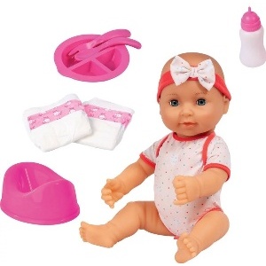 Ensemble d'accessoires de poupée pour jouer à faire semblant - Adapté à une poupée de 30 cm (12 pouces) - Contient 5 accessoires : un bavoir, une tétine, une couche, un biberon et un pot - Dimensions : du biberon 10 x 12 x 0.4 cm, du pot 11.8 x 12.4 x 7.5 cm - Matières : plastique, coton, polyester et fibre élastique - Pour jouer à faire comme les grands.