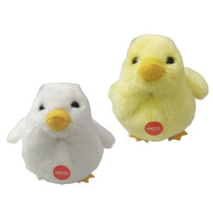 Peluche poussin assis sonore de 9 cm - Appuie sur ‘Press’ pour déclencher le son - 1 pile bouton (LR44) fournie : pile non remplaçable - Piles de démonstration fournies - 100% polyester, lavage en surface.