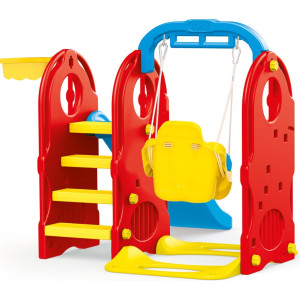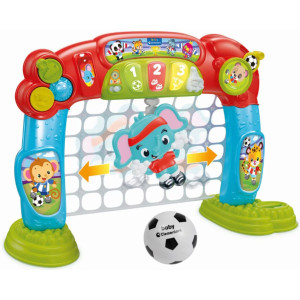 Centre de jeux pour enfants avec 6 jeux : toboggan, balançoire, 2 paniers de basket, mini terrain de football, cercles de lancer. Le berceau est doté d'une boîte à musique intégrée qui joue différentes mélodies et raconte des histoires en anglais. Comprend un ballon de basket et un ballon de football. Convient aux enfants de plus de 1 an.