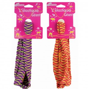 Jeu élastique Géant longueur 3m. Jouez à trois : 2 personnes se tiennent face à face et tendent l'élastique à hauteur de leurs chevilles. La troisième personne se positionne au centre et exécute des figures en sautant. Dès que le joueur rate une figure, il est remplacé par un des deux autres joueurs. Pour plus de difficulté, l'élastique peut être monté au niveau des genoux.