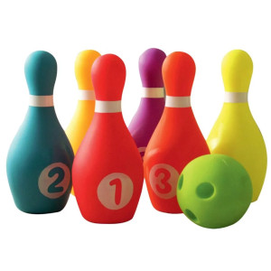 Jeu de 6 quilles en plastique - 2 boules couleurs assorties - Attention ! Ne convient pas aux enfants de moins de 36 mois - A partir de 3 ans+.