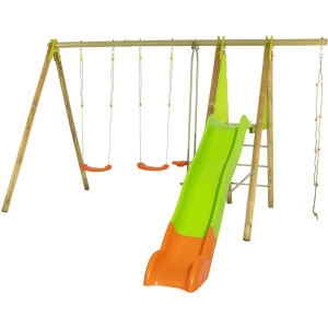 Portique Piji en bois et métal hauteur 2.30 m équipé d’un siège de balançoire soufflée réglable en hauteur coloris vert, d’un siège de balançoire bébé coloris vert et orange (pour enfant de 9 à 36 mois jusqu'à 20 kg maximum) ceinture de sécurité ventrale, siège et haut et enveloppant, barre de protection à l'avant assurant une grande sécurité pour l'enfant dimensions 49 x 38 x 34 cm, et d’une échelle de corde.