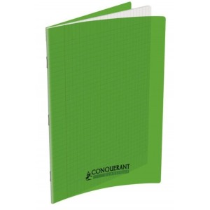 Cahier POLYPRO vert de 48 pages. Grands carreaux - Séyès. Dimensions : 170 x 220 mm. Reliure agrafée.Grammage : 90 g/m². Couleur de la couverture : Vert. Couverture translucide en Polypropylène (PP). Pas besoin de protéger le cahier.
