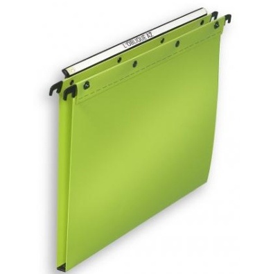 Dossiers suspendus indéchirables, indéformables et imperméables. Largeur du fond : 30 mm. Pour documents de format A4. Modèle : Polypro V Ultimate. Matière : Polypropylène épaisseur 5/10ème. Dos renforcé par une bande de polypropylène d'épaisseur 8/10ème pour une résistance maximale à la charge. Couleur : Vert. Fond strié pour éviter le glissement des documents à l'intérieur du dossier suspendu. Avec porte-étiquette extra-large effet loupe sur le côté. Barre de suspension métallique. système d'assemblage anti-déchirure (polypropylène riveté et finition soudure). Possibilité d'assembler les dossiers grâce au bouton pression en métal. Conditionnement : Lot de 10 dossiers suspendus.