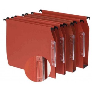 Dossiers suspendus en polypropylène épais 5/10e. Dos anti-déformation, grâce à une bande rigide striée. Assemblage par bouton pression métal. Porte-étiquette extra-large. Entraxe de 390mm.