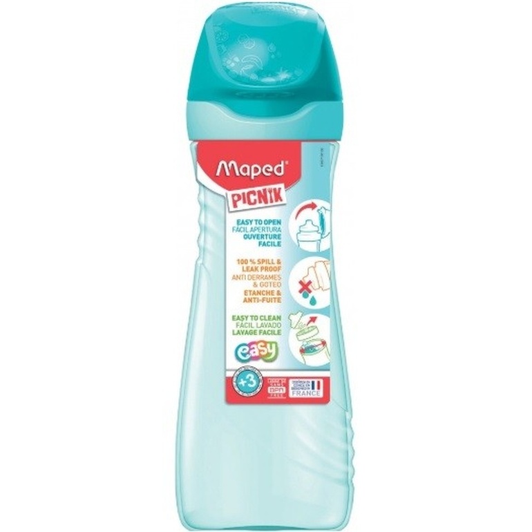 Gourde 580 ml - Maped PICNIK ORIGINS coloris Turquoise. Soulever le couvercle de protection pour ouvrir, étanche, embout buccal entièrement démontable, en plastique Dimensions: 79,3 x 83 x 235,5 mm