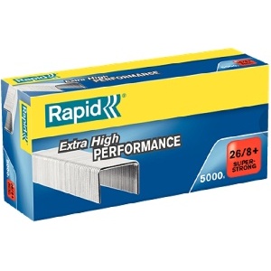 Rapid Agrafes 26/8+ G SUPERSTRONG x5000 - Pour agrafer jusqu'à 50 feuilles - 80 g/m² - Chaque boîte contient 5000 agrafes - Symbole Rouges pour renforcer la segmentation fort - Dimensions du produit (L x l x h) : 11.4 x 5.4 x 1.14 cm - Poids de l'article : 200 grammes.