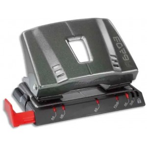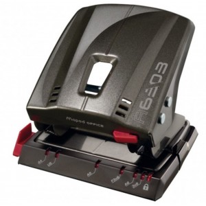 Capacité de perforation : 30 feuilles. En métal. Thermo poudré avec réglette de butée. Perforation : 80mm. Verrouillage du haut. Réserve à confettis à charnière. Système de centrage de papier par mécanisme de classeur à anneaux.