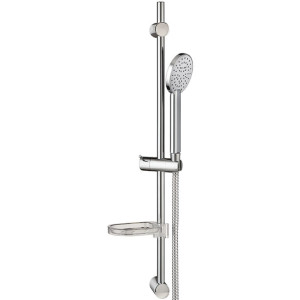 Barre: Barre Ø1,8 cm en inox chromé. Patères murales réglables (hauteur : 70 cm). Support de douchette : 1 position en ABS. Porte savon transparent. Douchette: 1 jet : pluie fine, mixage air/eau soft. Ø10 cm. Consommation d'eau : 12 L/mn. Picots anticalcaire. Flexible. PVC Soft blanc/chromé. Longueur 1m50.Résiste à 30 Kg de traction. Écrou de robinetterie en laiton chromé. Écrou de douchette en ABS chromé.