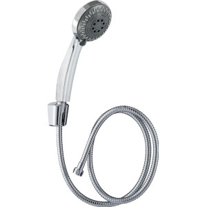 Douchette de 1 jet (pluie fine). Diamètre : 10 cm. Consommation d'eau : 10 L/min. Un joint réducteur de débit a été ajouté à la douchette pour économiser l'eau sans perte d'efficacité. Picots anticalcaire. Bouton stop-jet.