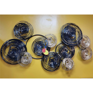 Décoration murale design « cercle » (Ø 63 cm) en métal doré, au style à la fois tendance et moderne, idéal pour apporter une touche de raffinement à tout intérieur. Avec des dimensions L 47 × l 7 × H 63,5 cm et un poids de 0,8 kg, elle combine légèreté et élégance. Sa structure de cercles déstructurés capte la lumière, créant un jeu visuel subtil sur le mur, que ce soit dans un salon, une entrée ou une chambre, pour une déco chic et contemporaine.