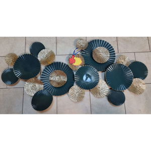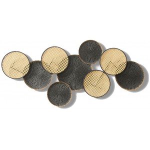 Décoration murale Mirage (Ø 63 cm) en métal noir et doré, conçue comme un cercle élégant aux finitions raffinées. Son design sophistiqué et sa nuance bicolore apportent une touche raffinée et contemporaine à tout intérieur. Avec des dimensions de L 47 × l 63,5 × H 7 cm et un poids d’environ 1 kg, elle reste légère à suspendre tout en marquant fortement le mur. Idéale pour enrichir un salon, une entrée ou une chambre avec style et personnalité.