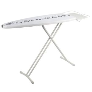 Table à repasser avec plateau en maille d'acier de dimensions (LxPxH) 114,5x35,5cm - Diamètre des pieds ronds : 22/28/35 mm - Housse 100 % coton avec sous-couche en feutre de 7 mm - Hauteur réglable jusqu'à 90 cm - Couleur du revêtement en poudre : Blanc / Noir / Argenté - Couleur du plastique : Gris / Noir