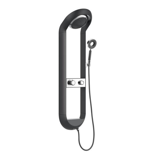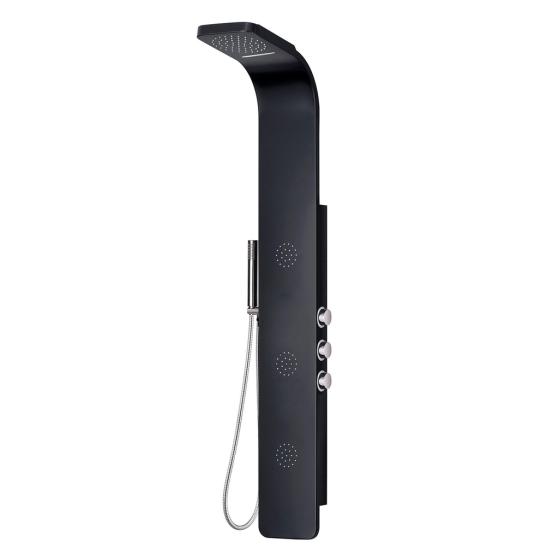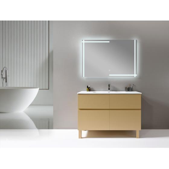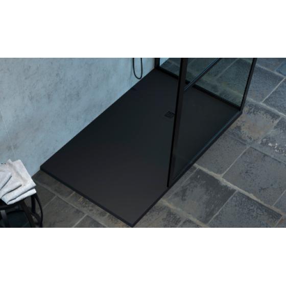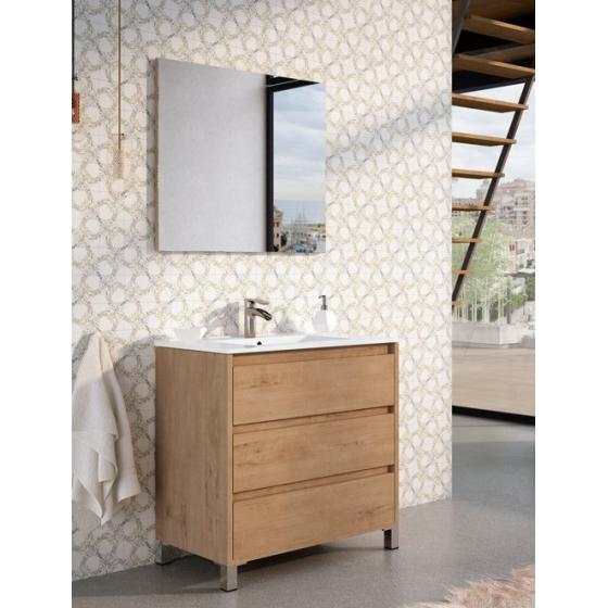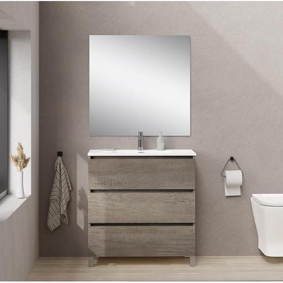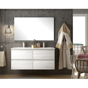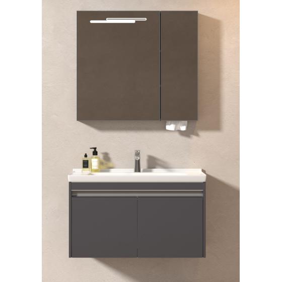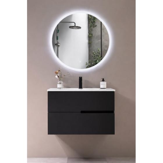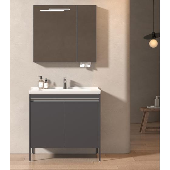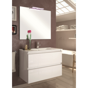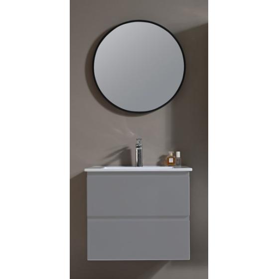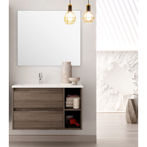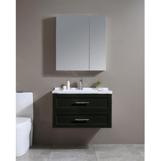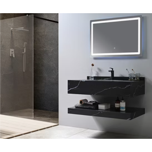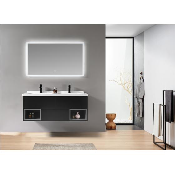 Meuble gain de place, matière hydrofuge, résistant à l'eau. Meuble : 45x25x48 cm Miroir : 42x75 cm. Portes et tiroirs avec système soft-close Coloris : noir. Bonde et robinet non inclus.