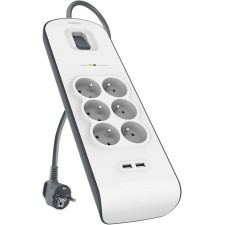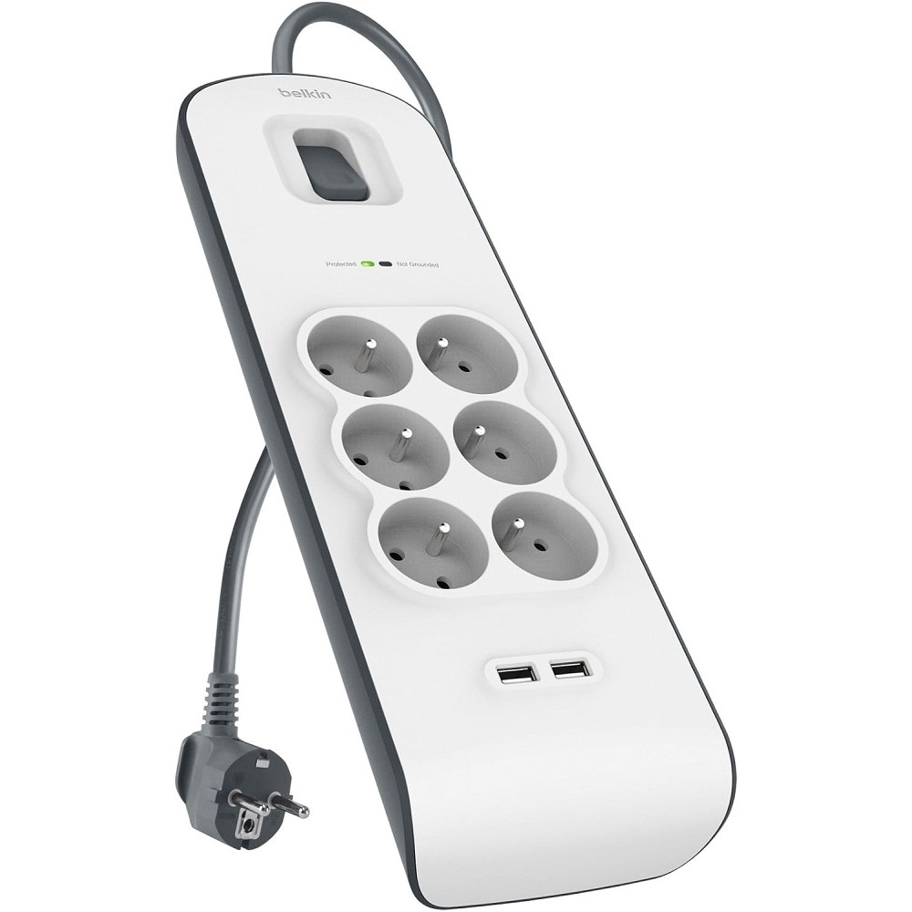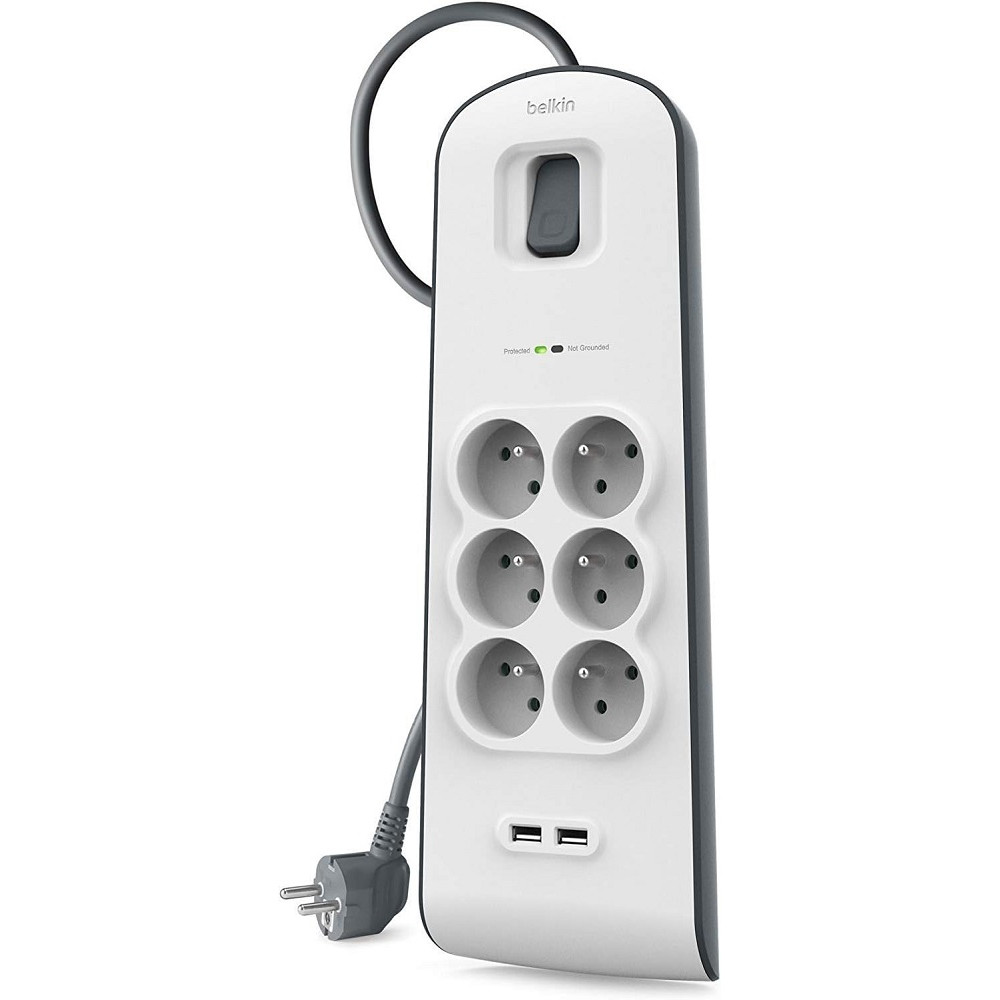 Multiprise parafoudre BELKIN - Nombre de prise : 6 prises - 2 pôle + terre - Courant nominale : 2,4 A (ampères) - 2 prises USB - Interrupteur - Longueur : 2 m - Couleur : Gris.