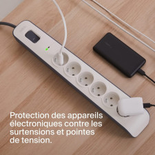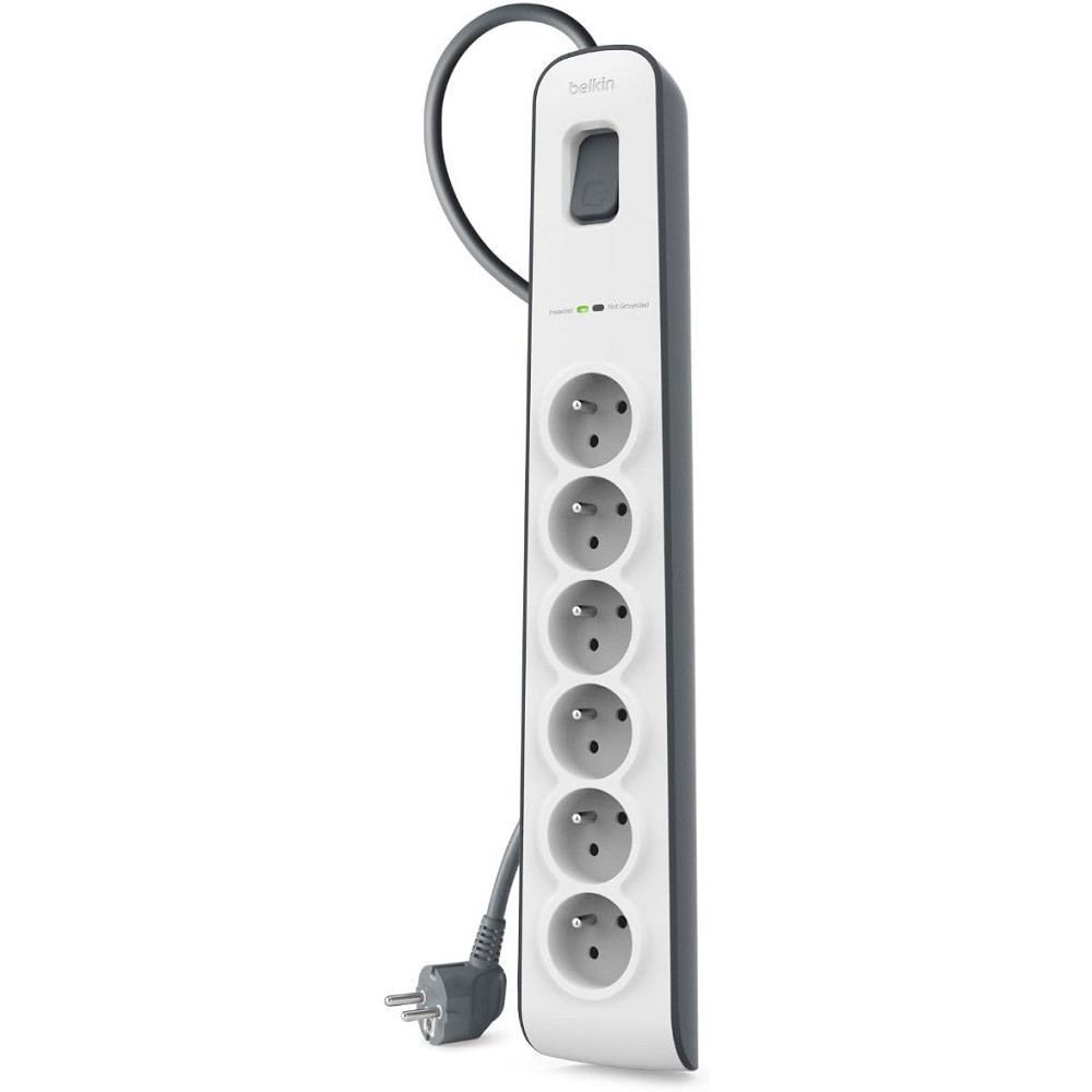 Multiprise parafoudre BELKIN - Nombre de prise : 6 prises - 2 pôle + terre - Courant nominale : 2,4 A (ampères) - 2 prises USB - Interrupteur - Longueur : 2 m - Couleur : Gris.