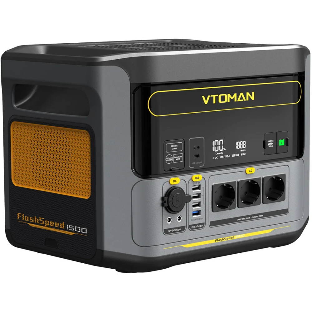Power Station FlashSpeed VTOMAN 1500 avec port d'entrée AC de 1500W - Se recharge de 0 à 100% en seulement 1 heure - Aucun adaptateur AC nécessaire - Bénéficie de la technologie V-Beyond qui améliore l'ondulateur et permet à l'appareil de fournir de l'énergie dépassant les 1500W - Idéal pour les activité en plain air, les sauvegardes à domicile et les situations d'urgence - Permet de charger jusqu'à 12 appareils simultanément - Est équipé d'un système de protection Supersafe LifeBMS - Permet de charger des appareils pendant que la station d'alimentation se charge elle-même.