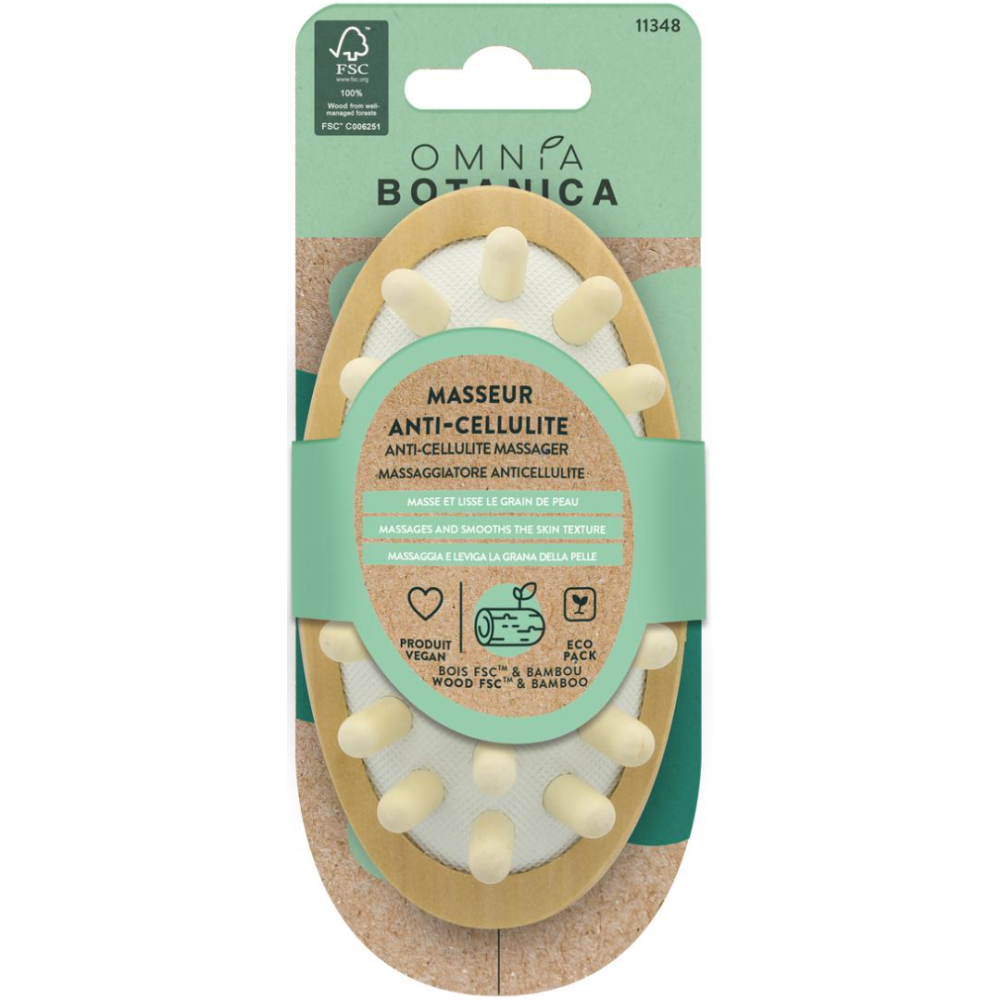 Masseur anti-cellulite en bois Omnia Botanica tonifie la peau et ralentit l'apparition de cellulite - Procure une sensation de bien-être et une action beauté pour une peau plus ferme et plus lisse - Dispose de picots en bambou et d'un coussin en caoutchouc naturel afin d'exclure l'utilisation de plastique - Produit pensé dans une démarche éco-responsable. Composition: bois, FSC, bambou.