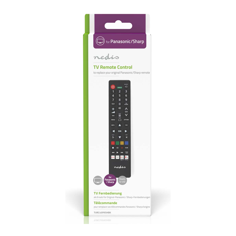Remplacez une télécommande Panasonic / Sharp perdue ou cassée par cette télécommande de remplacement NEDIS TV préprogrammée, compatible avec tous les téléviseurs Panasonic / Sharp. Grâce à une vaste base de données de codes intégrés, elle dispose de toutes les fonctions de la version originale. La télécommande de remplacement NEDIS est facile à utiliser car elle ne nécessite aucune programmation. Il suffit d'insérer les piles et le tour est joué. Comprend des raccourcis pour Netflix, Amazon Prime, Disney, Rakuten TV, YouTube.