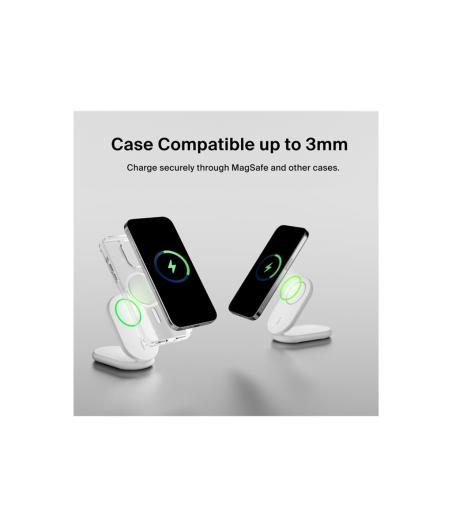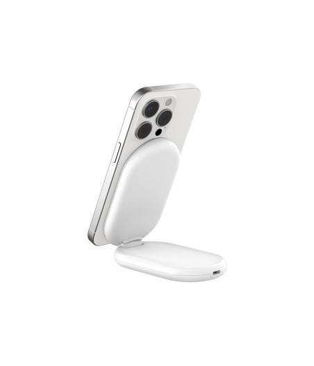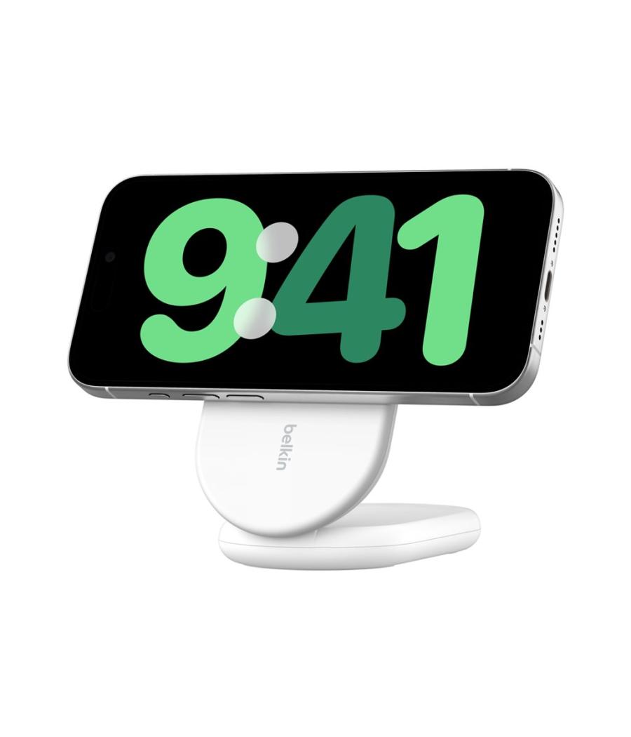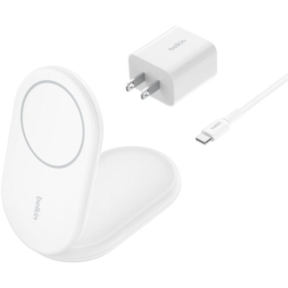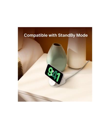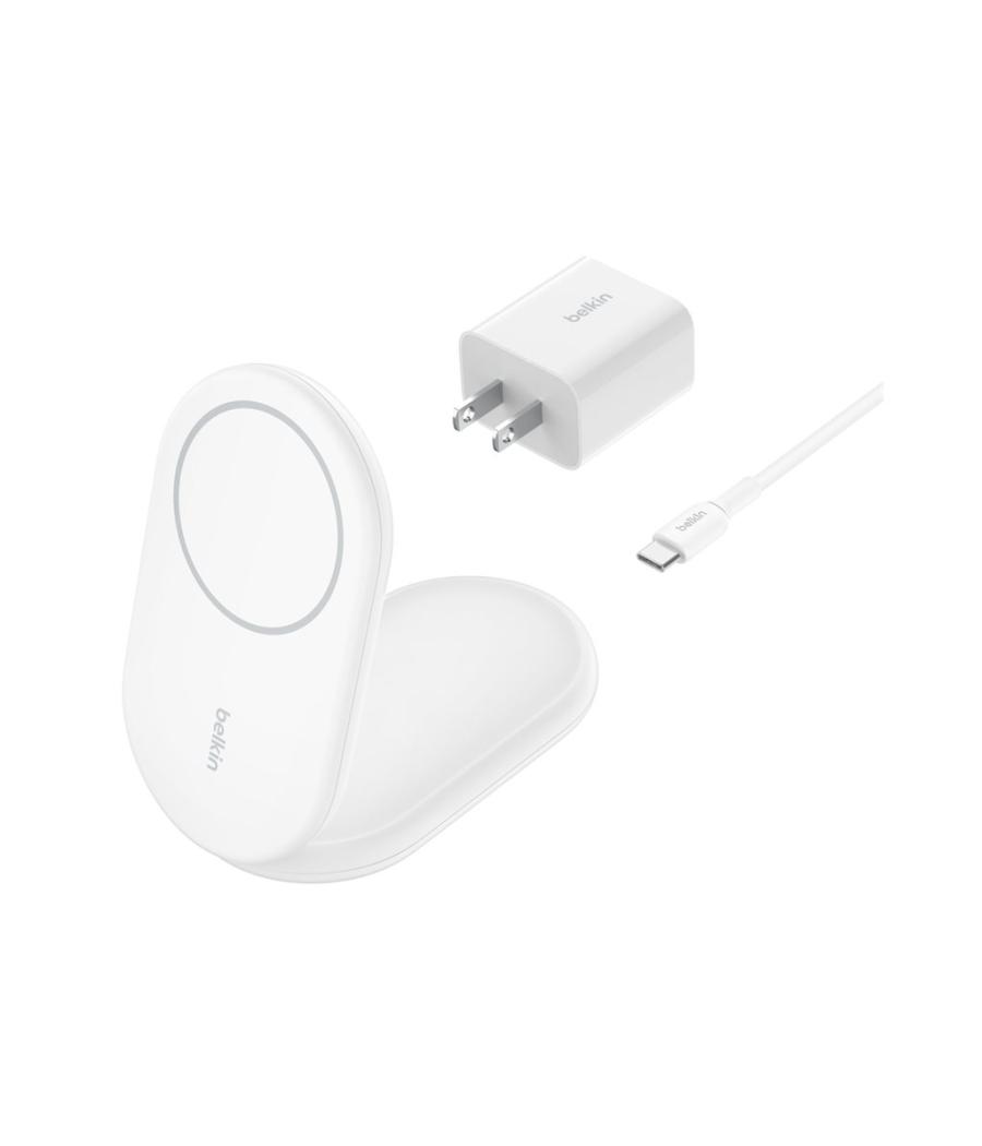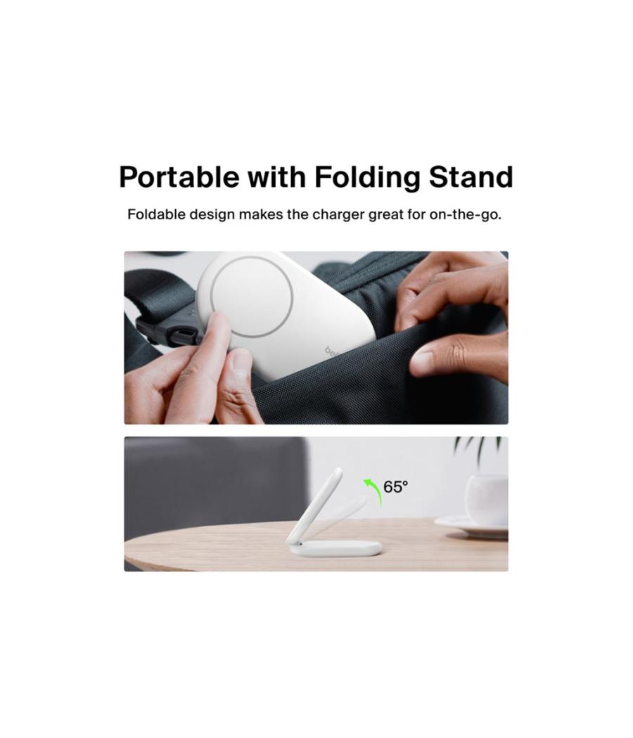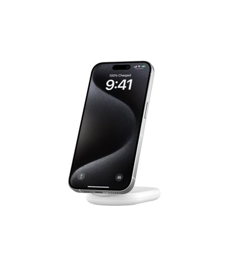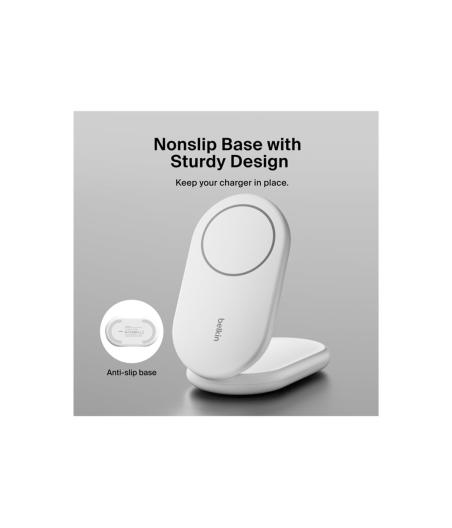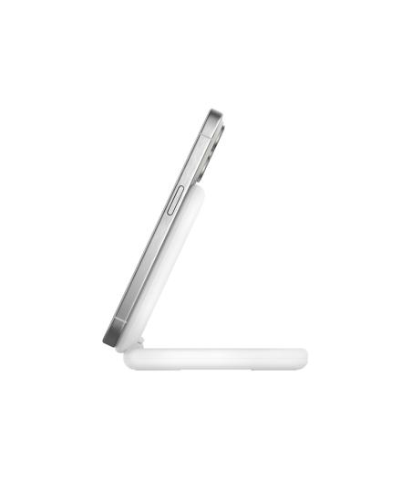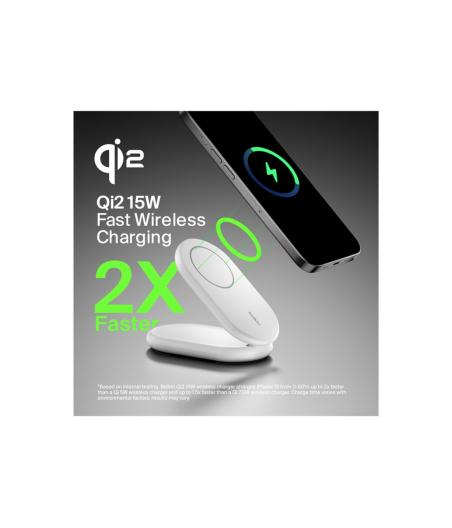 Belkin BOOST CHARGE - Support de chargement sans fil - magnétique, pliable, avec Qi2 + adaptateur secteur - 15 Watt - 3 A - Fast Charge, Power Delivery 3.1 - blanc