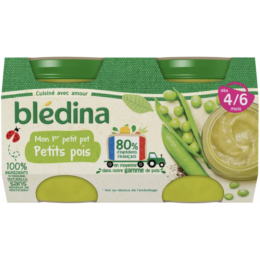 Petits pots aux petits pois BLÉDINA - Contenance : 2x130 g - Mon 1er Petit Pot - Petits pois pour bébés de 4 à 6 mois  - Contenant : Petit pot, sans conservateur - Avantages : Texture lisse pour les premières cuillères de bébé - Composition : 60% de petits pois, eau de cuisson - Allégations nutritionnelles : Sans résidus de pesticides, sans sel ajouté - Conservation : À température ambiante avant ouverture, 48 h maximum au réfrigérateur après ouverture - Mode d'emploi : Réchauffer au bain-marie ou au micro-ondes - Valeurs nutritionnelles pour 100 g/ml : 56 kcal, 0,6 g matières grasses, 6,9 g glucides, 3,9 g fibres alimentaires, 3,9 g protéines, 0,04 g sel - EAN : 3041091677273.