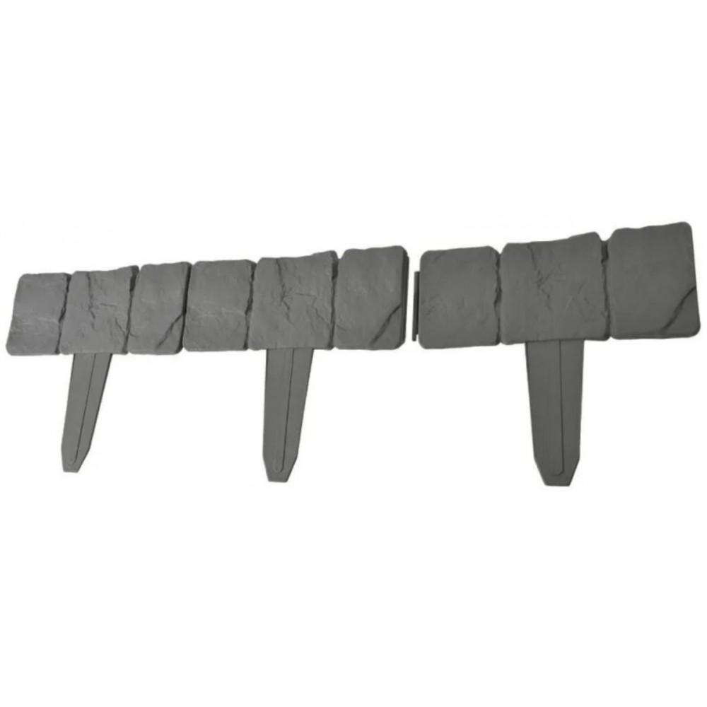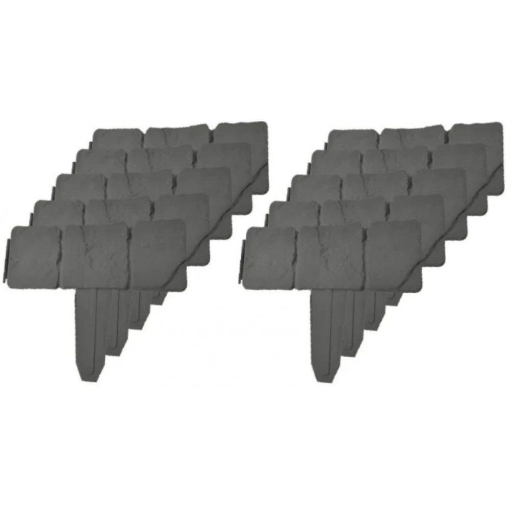 Bordures de jardin imitation pierre / ardoise - grise - vendu par 10. Délimitez parfaitement vos massifs de fleurs grâce à ce lot de 10 bordures de jardin imitation pierre. Ces bordurettes permettent de mettre en valeur vos fleurs et autres éléments de votre jardin. Avec les bordures de jardin, vous pourrez créer des formes droites ou courbées. Le montage est très simple puisque les bordures s'emboitent les unes aux autres. Informations techniques. Hauteur des bordures imitation pierre hors pied : 10 cm. Hauteur des pieds : environ 13 cm. Longueur totale (le lot de 10 bordures mis bout à bout) : 2,5 mètres. Epaisseur : environ 1 cm. Matière : plastique pp. Poids d'une bordurette : 80 g. Couleur : gris imitation : pierre grise type ardoise.