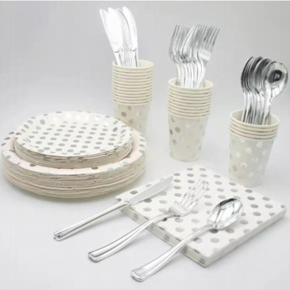 Assiettes en carton impression pois, coloris: argent, or, rose-gold, rose, rouge, jaune. Paquet de 10 pièces. Dimensions: 17cm.