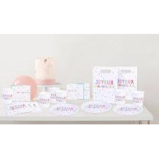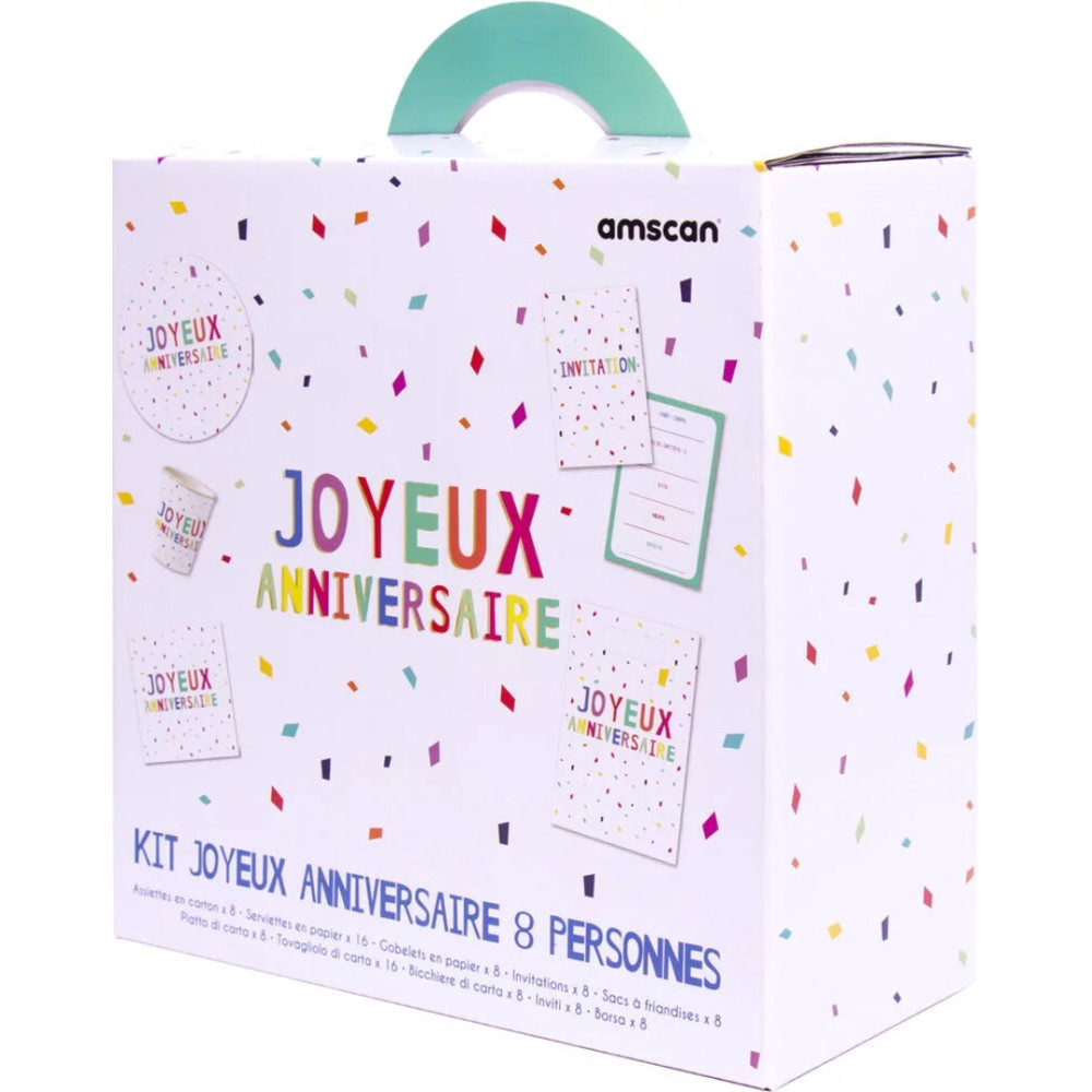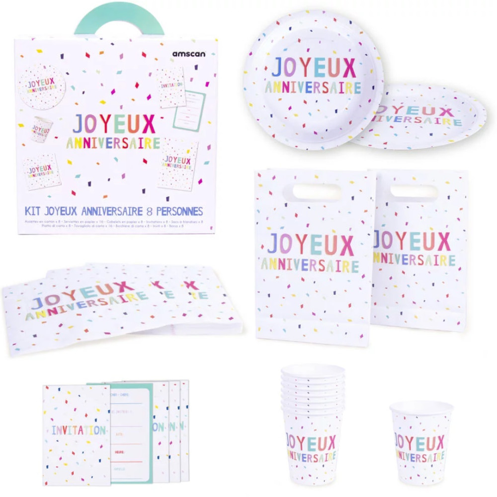 Set anniversaire ultra pratique, tout inclus, pour préparer un anniversaire inoubliable ! Contenu : 8 assiettes rondes de 23 cm en papier imprimé avec vernis à l’eau, 16 serviettes en papier imprimé 3 3 x 33 cm (3 plis), 8 gobelets en papier imprimé de 260 ml (soit 26 cl), 8 invitations 7 x 10,5 cm (sans enveloppe), et 8 sachets en papier 15,8 x 23,6 cm (pour bonbons ou petits cadeaux non fournis) - Dimensions de la boîte : 23.5 x 23.5 x 9.5 cm.