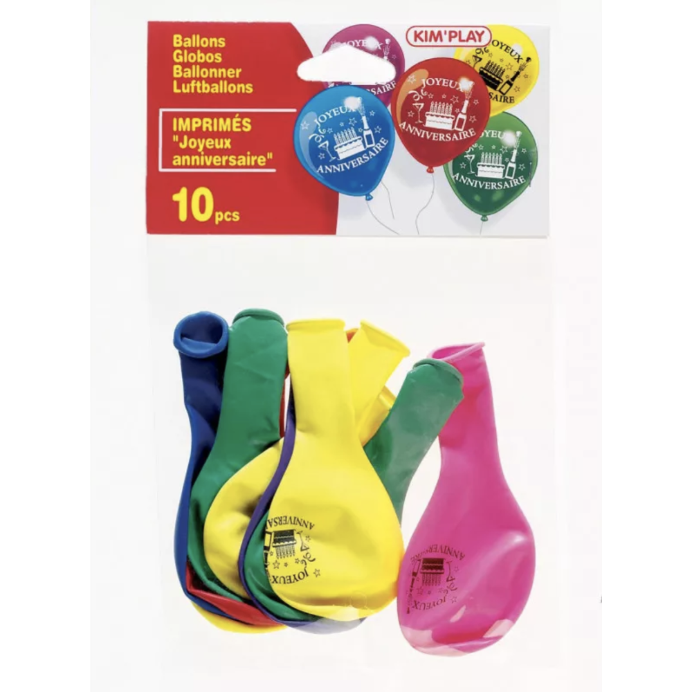 Sac de 10 ballons “Joyeux Anniversaire” - Marque : KIM'PLAY - Type : Accessoire de fête - Couleur : Multicolore - Contenu : 10 ballons en latex imprimés “Joyeux Anniversaire” - Dimensions du sachet : 15 x 22 x 1 cm - Âge recommandé : Dès 3 ans (sous surveillance d’un adulte) - Matière : Latex naturel résistant et élastique - Gonflage : À l’air ou à l’hélium - Utilisation : Décoration d’anniversaire, fêtes d’enfants, goûters, animations - Sécurité : Conforme aux normes CE - Conditionnement : Sachet plastique transparent avec étiquette.