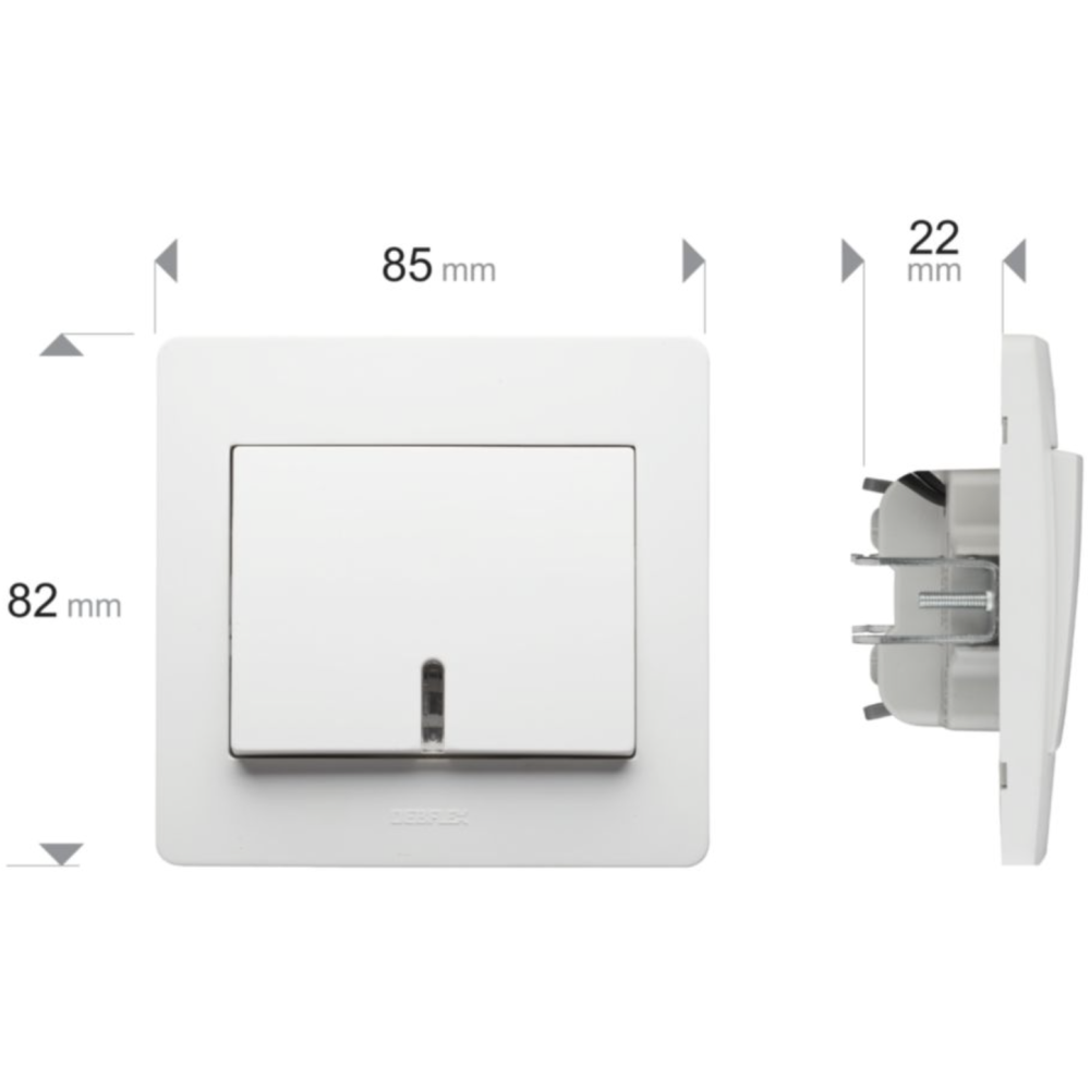 Interrupteur va-et-vient Debflex DEB739350 Diam2 - Marque : DEBFLEX - Série : Diam2 - Mécanisme, plaque et cache inclus - 3 bornes automatiques - Fixation par vis ou par griffes - Finition en blanc mat - Profondeur d'encastrement : 22 mm - Dimensions (L x l x P) : 85 x 82 x 37 mm - Capacité des bornes : 1,5 mm² - Longueur de dénudage : 9 mm - Tête de vis : Philips n°3 - Compatible avec boîtes de profondeur 40 mm - Étanchéité : IP20 - Résistance aux chocs : IK02 - Résistance au fil incandescent - Résistance au feu : 650°C - Courant nominal : 10A - Tension nominale : 250V - 50Hz - Puissance nominale : 2200W - Durée de vie : 20 000 cycles - Tenue diélectrique : 2000V - Résistance aux UV.