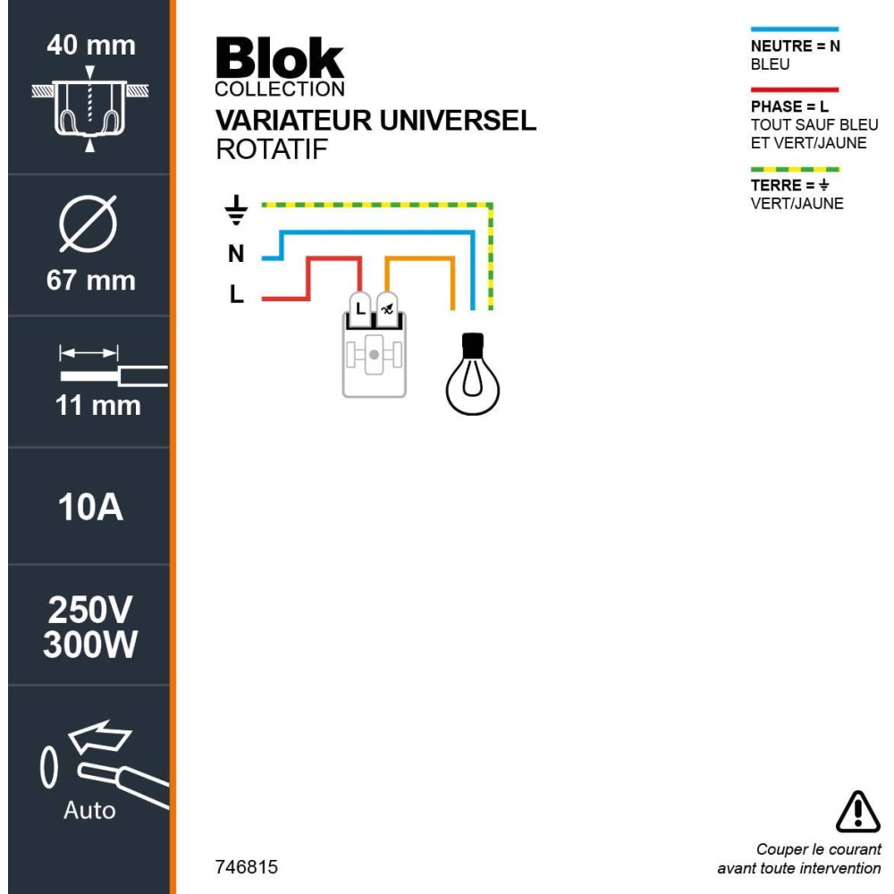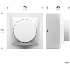 Variateur rotatif en saillie LED Debflex 746815 Blok - Référence : 746815 - Gamme : BLOK - Montage : En saillie - Fonction : Appareillage saillie, compatible ampoules LED, sans neutre pour rénovation - Finition : Mat - Couleur : Blanc - Dimensions : 70 x 70 x 45 mm - Poids : 57 g - Matière : ABS - Nombre de bornes : 1,5 mm² - Type de vis : Philips n°3 - T° Fonctionnement : -5 à 50°C - Indice de protection : IP20 - Tenue aux chocs : IK02 - Tenue au feu : 650°C - Tension nominale : 250 V - Puissance nominale : LED : 200 W ; Halo : 400 W ; BT 12V : 150 W - Tenue diélectrique : 2000 V.