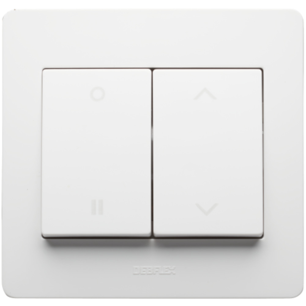 Commande de volet roulant - Reference : DEB-739270 - Gamme : DIAM2 – Marque : DEBFLEX - Permet de piloter un moteur de volet roulant (montée, descente, arrêt) - 2 touches de commande simples et efficaces - Pour moteurs jusqu’à 500 W, 10 A, 250 V - Raccordement facile par bornes automatiques (câbles rigides ou souples jusqu’à 1,5 mm²) - Compatible avec fixations à vis ou par griffes - Dimensions : 85 x 82 x 37 mm — Poids : 63,5 g - Indice de protection : IP20 — Résistance aux chocs : IK02 - Températures : fonctionnement de 5 à 35°C / stockage de -5 à 50°C - Couleur : blanc — Matière : ABS / PC.