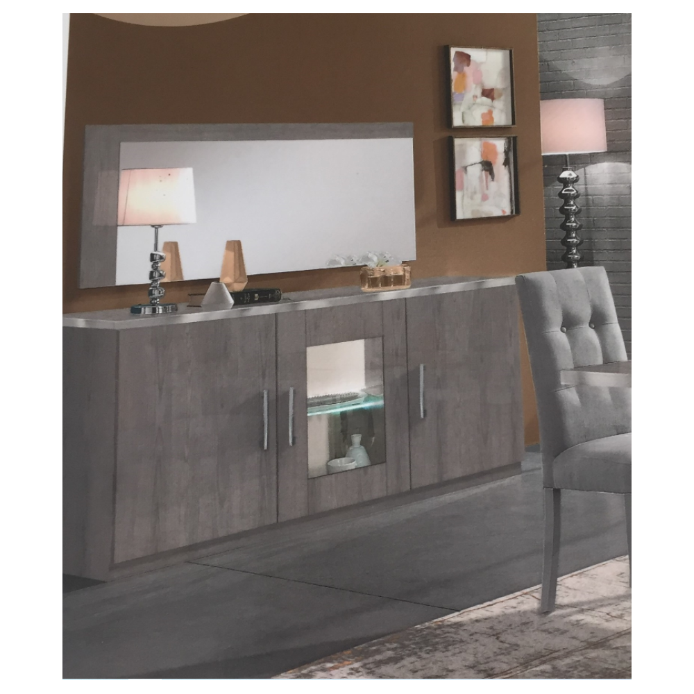 L’enfilade NIVES se présente avec 3 portes, surmontées de 3 tiroirs avec  le miroir inclus. Sa structure est laqué chêne gris argent. Les poignées portes sont noires, contrastant avec le laqué blanc. Dimensions : 180 x 49 x H85 cm.