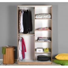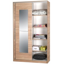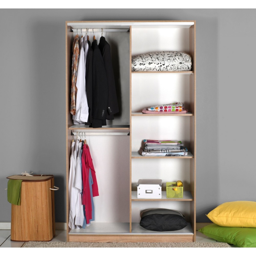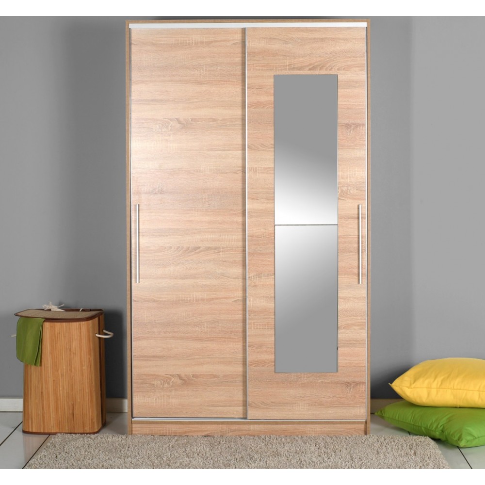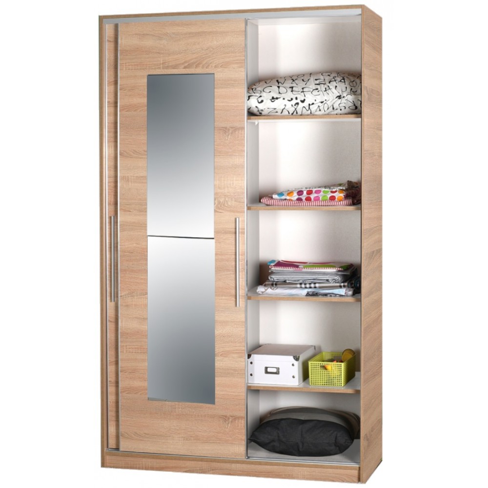 Armoire LUIS à portes coulissantes et 1 miroir - 100% panneau de particules mélaminé - Dimension : 160x207x60 - Poignées avec revêtement en chrome - Portes coulissantes avec 1 miroir - Côté droit, 1 espace de rangement en haut, 4 sections à droite et 1 penderie pour vêtements longs à gauche - Côté gauche, 2 penderies - Cadre métallisé sécurisé - Couleur : Sonoma.