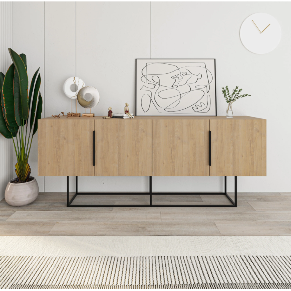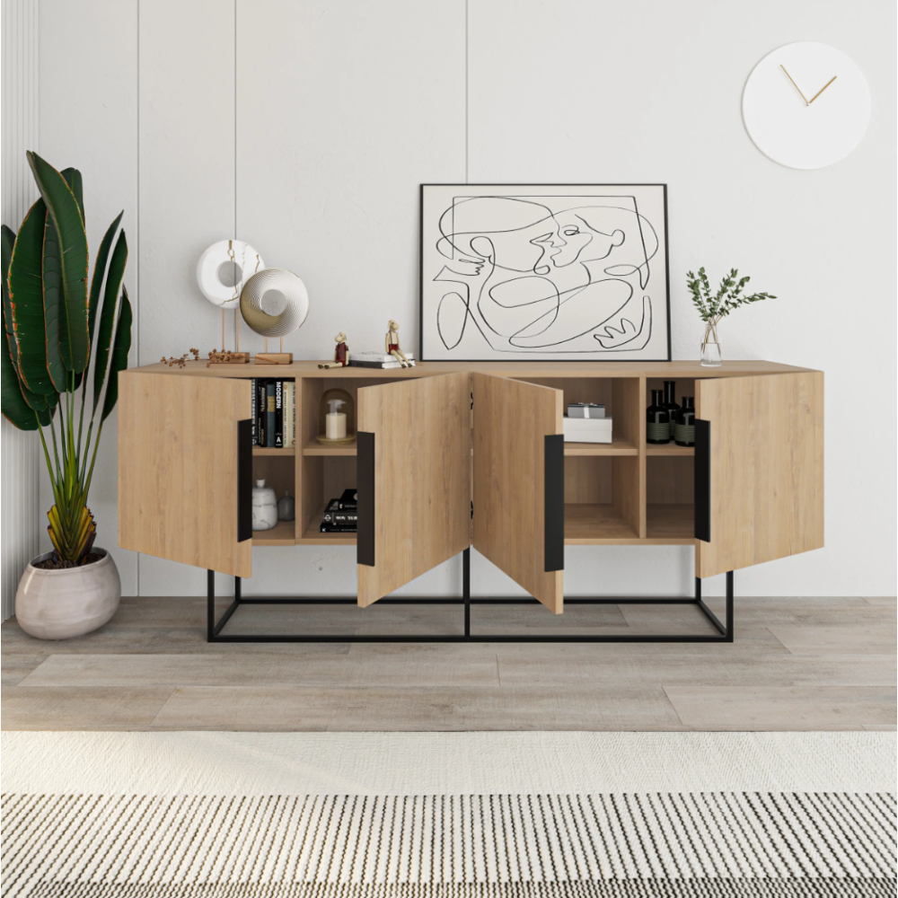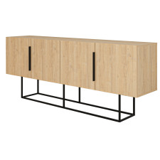 Buffet Titan de forme rectangulaire - Intègre 4 cavités de rangement et 2 poignées plates de couleur noire - Monté sur un socle en métal de couleur noire - S'installe en pose libre dans une salle de séjour ou toute autre pièce - Affiche un design fin et stylé avec une couleur de bois de chêne - Mesure exactement 200 cm de long pour 80 cm de large et 40 cm de profondeur  - Inclut une étagère à l'intérieur de chaque cavité de rangement.