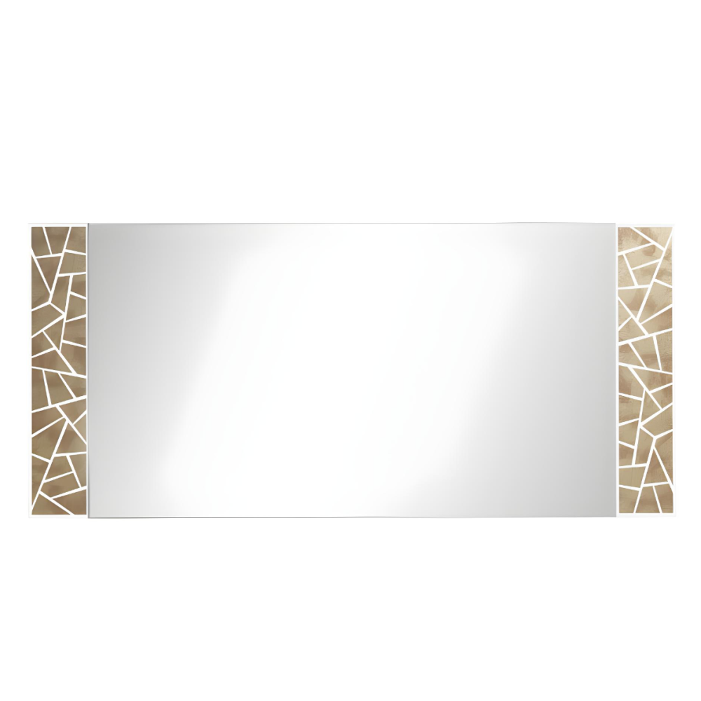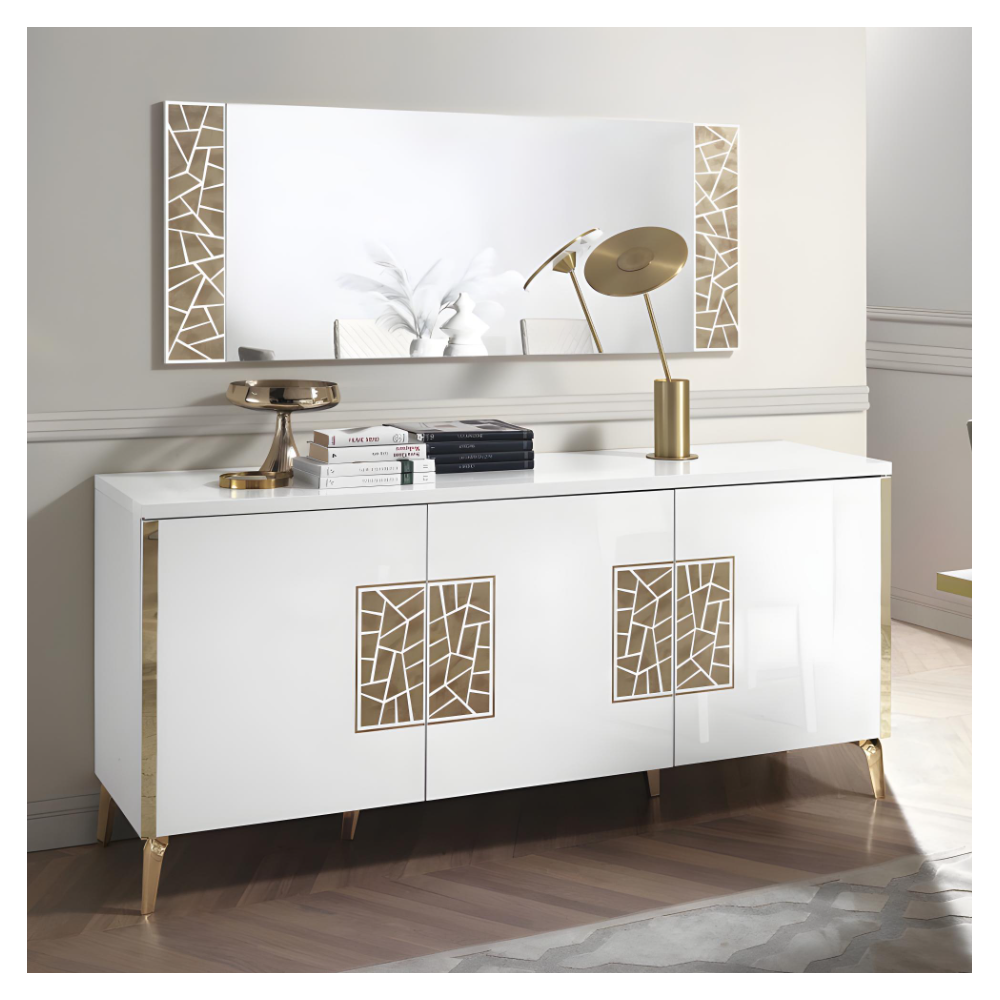Enfilade STELLA - Matière: Panneaux de particules (18 mm), finition blanc brillant et or - 3 portes avec système de freinage - 1 étagère derrière les portes - 1 étagère derrière les portes - Système d'ouverture : Battant - Dimensions: Buffet : L 180 x l 48 x H 83 cm ; Miroir : L 150 x l 2 x H 60 cm.