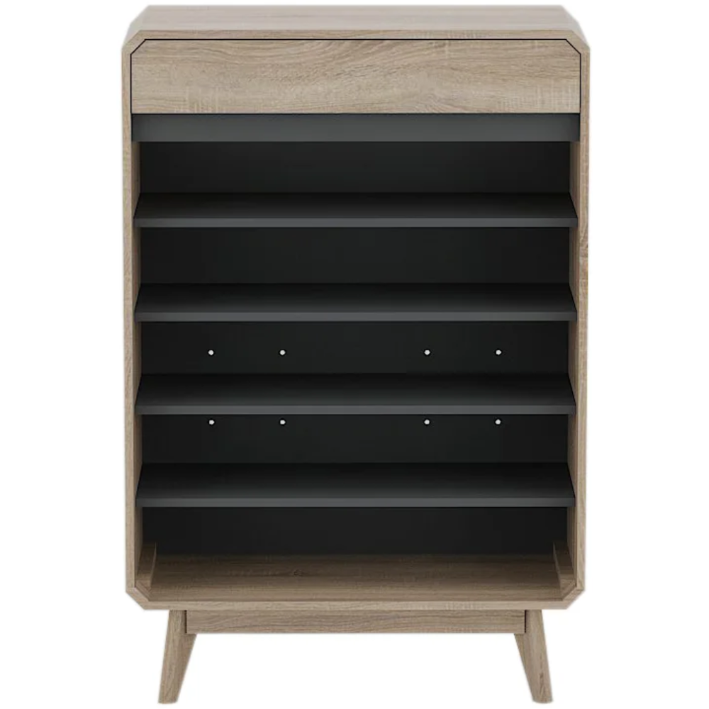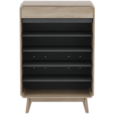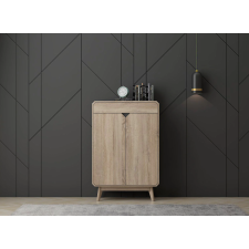 Meuble chaussure Hana faisant 798 cm de long, 340 cm de large et 1160 cm de haut - Dispose d'une base solide présentée avec 4 pieds - Doté de 2 portes s'ouvrant vers l'avant avec poignées intégrées - Présente des angles nets et des finitions propres - Offre une surface supérieure pouvant être destinée à accueillir des objets de décoration ou un panier d'utilitaires du quotidien.