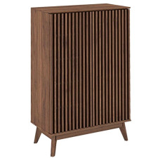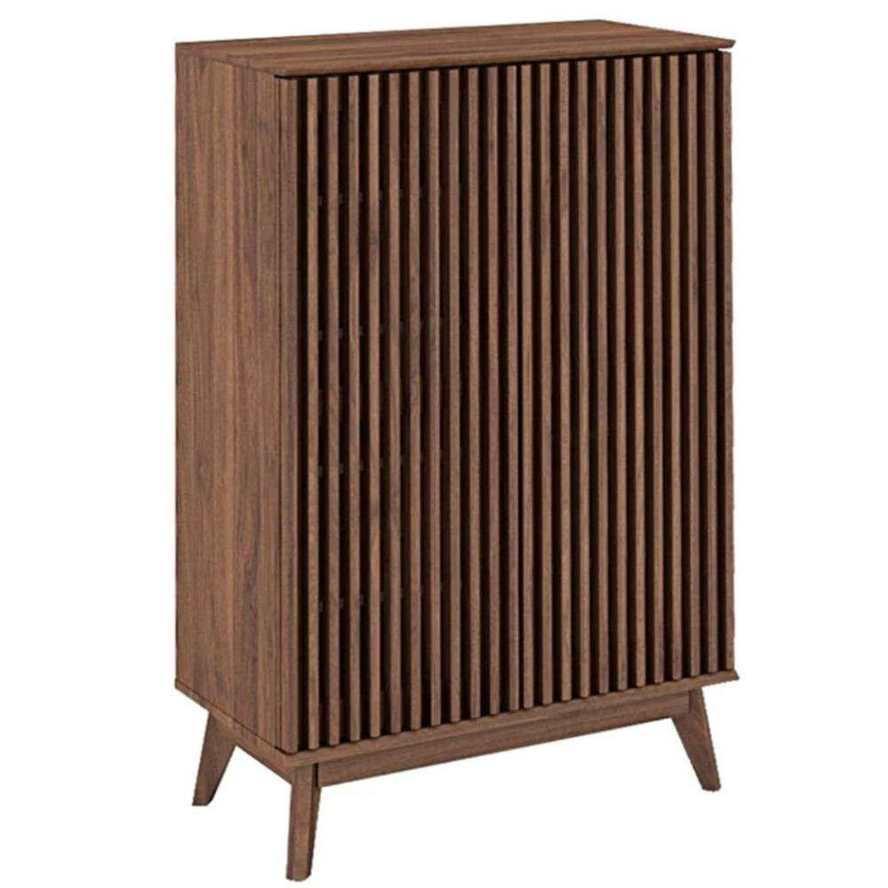 Meuble chaussures composé de 4 étagères de rangement offrant une capacité d’environ 15 paires de chaussures - Dispose de 2 portes à l’avant servant à sécuriser le meuble - Monté sur 4 pieds stables fabriqués en bois - Présente un design original avec des décorations en forme de lambris alignés - Affiche une texture lisse et vernie qui rehausse son originalité - Présente un petit plateau supérieur pouvant accueillir des objets décoratifs.