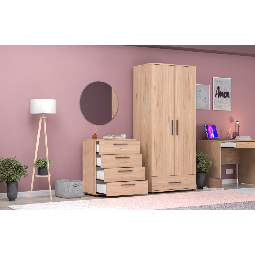 Cette très jolie armoire de la collection Catherine avec 4 portes et 2 tiroirs se glissera facilement dans le moindre de vos espaces. L’armoire dressing est un meuble aussi pratique que tendance avec son décor et son coloris caramel oak. Finis les soucis de vêtements qui trainent à droite et à gauche ! Structure en panneau de particules recouvert de papier coloris caramel oak. Dimensions : 156x48xH183cm.