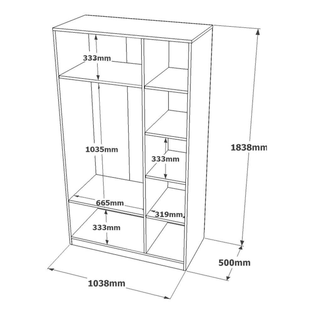 Armoire Hana WR1508MP-HO - À disposer idéalement dans une chambre à coucher - Montée sur 4 pattes servant de support au meuble - Intègre 4 étagères internes et un tiroir bas pour le rangement du linge ou d’accessoires divers - Embarque un espace avec une tringle pour l’accrochage des vêtements sur cintre - Dispose de 3 portes fermant le meuble pour une sécurisation optimale des effets rangés dans le meuble - Dimensions exactes de l’armoire : 110 cm de long, 500 cm de large et 1970 cm de haut.