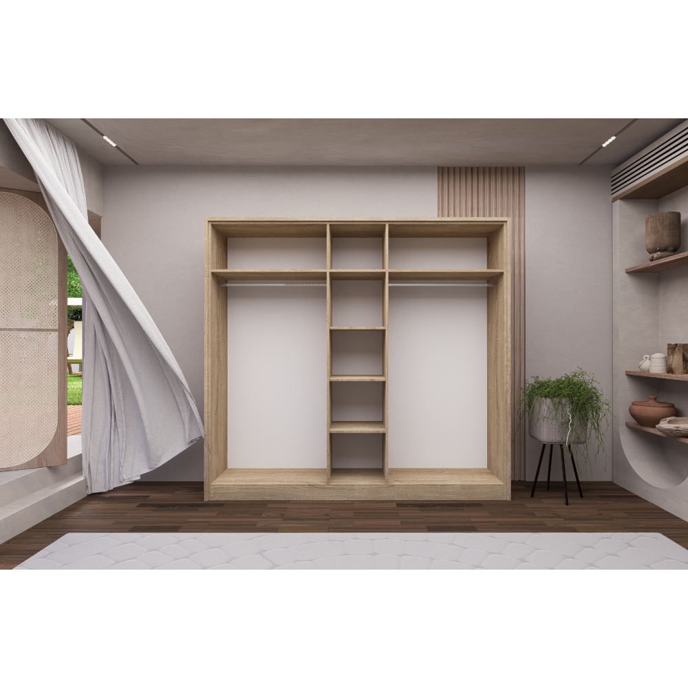 Armoire LUX ARM_LUX5P - Apportez une touche moderne et élégante à votre chambre avec l’armoire LUX 5 portes, dont 3 portes avec miroir pour agrandir visuellement l’espace et faciliter votre quotidien. Son design contemporain associe parfaitement des lignes sobres et une finition chaleureuse effet bois. Très pratique, elle offre une grande capacité de rangement grâce à ses compartiments spacieux, étagères et penderies idéales pour organiser vêtements, linge et accessoires. Dimensions : 220 x 210 x 52,2 cm.