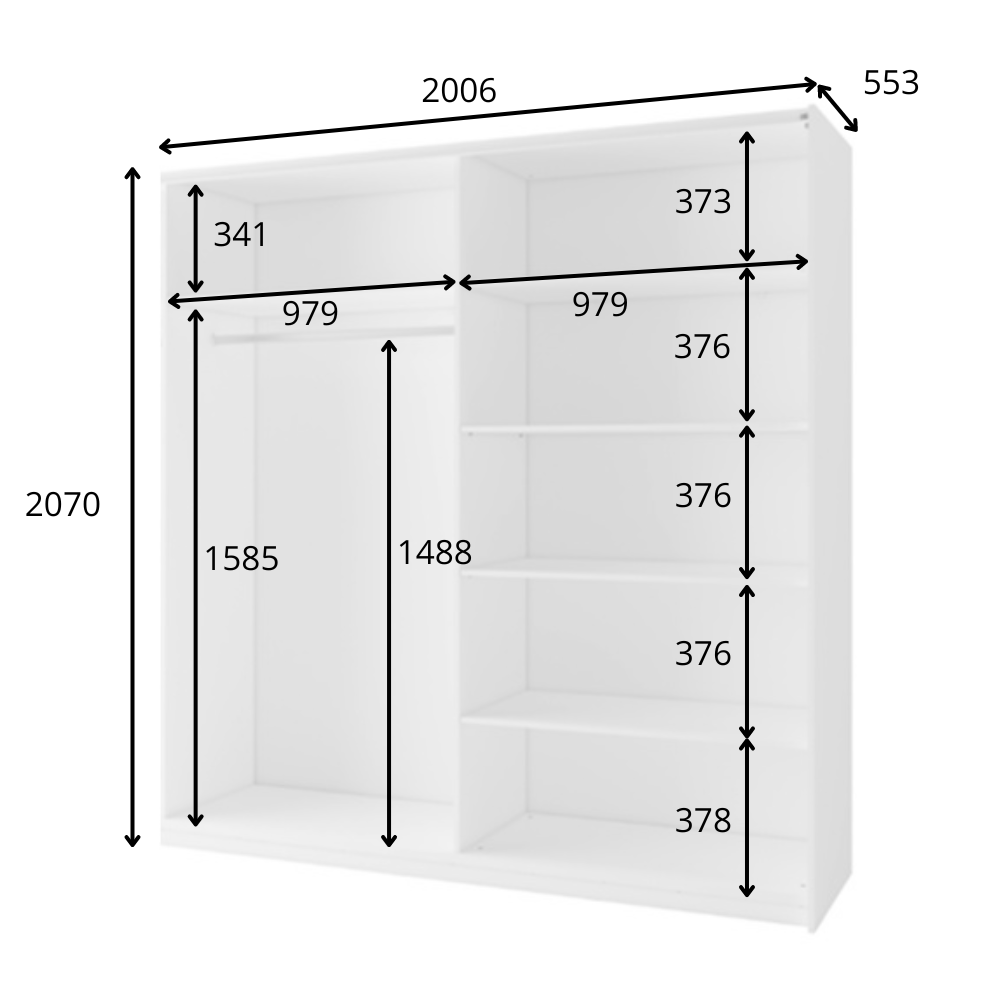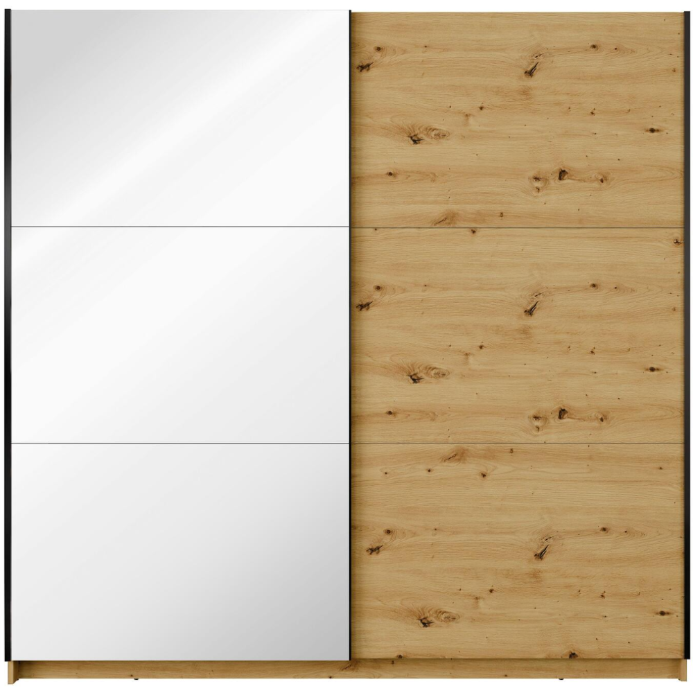 Armoire coulissante ARSEN avec miroir : apportez style et praticité à votre chambre avec cette armoire moderne. Son design bicolore blanc + bois naturel est sublimé par une grande porte miroir idéale pour agrandir visuellement l’espace. Très fonctionnelle, elle dispose d’une large penderie et de plusieurs étagères pour organiser vêtements, linge et accessoires. Dimensions : L 200,6 cm x H 207 cm x P 55,3 cm. Compartiments intérieurs : 2 espaces de 97,9 cm de large, penderie H 158,5 cm, étagères H 37,3/37,6/37,6/37,6/37,8 cm.