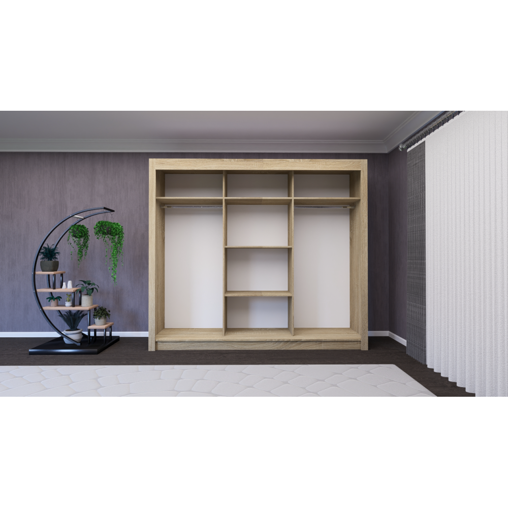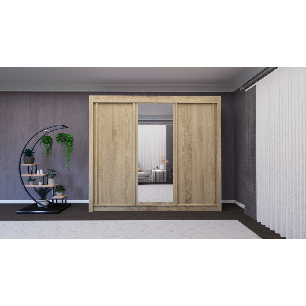 Armoire coulissante QUADRO 240 - Avec ses dimensions généreuses 240 x 215 x 61,8 cm, elle offre un grand espace de stockage idéal pour organiser vêtements, linge et accessoires. Ses portes coulissantes permettent un gain de place parfait, même dans les pièces étroites, et l’une d’elles intègre un miroir central pratique pour vos essayages au quotidien. Son design moderne finition bois s’adapte facilement à tout type de décoration. Une armoire fonctionnelle, élégante et spacieuse.