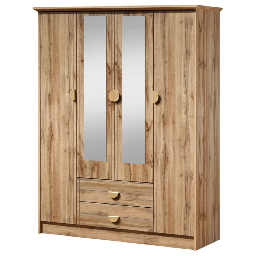 Cette très jolie armoire de la collection Catherine avec 4 portes et 2 tiroirs se glissera facilement dans le moindre de vos espaces. L’armoire dressing est un meuble aussi pratique que tendance avec son décor et son coloris caramel oak. Finis les soucis de vêtements qui trainent à droite et à gauche ! Structure en panneau de particules recouvert de papier coloris caramel oak. Dimensions : 156x48xH183cm.