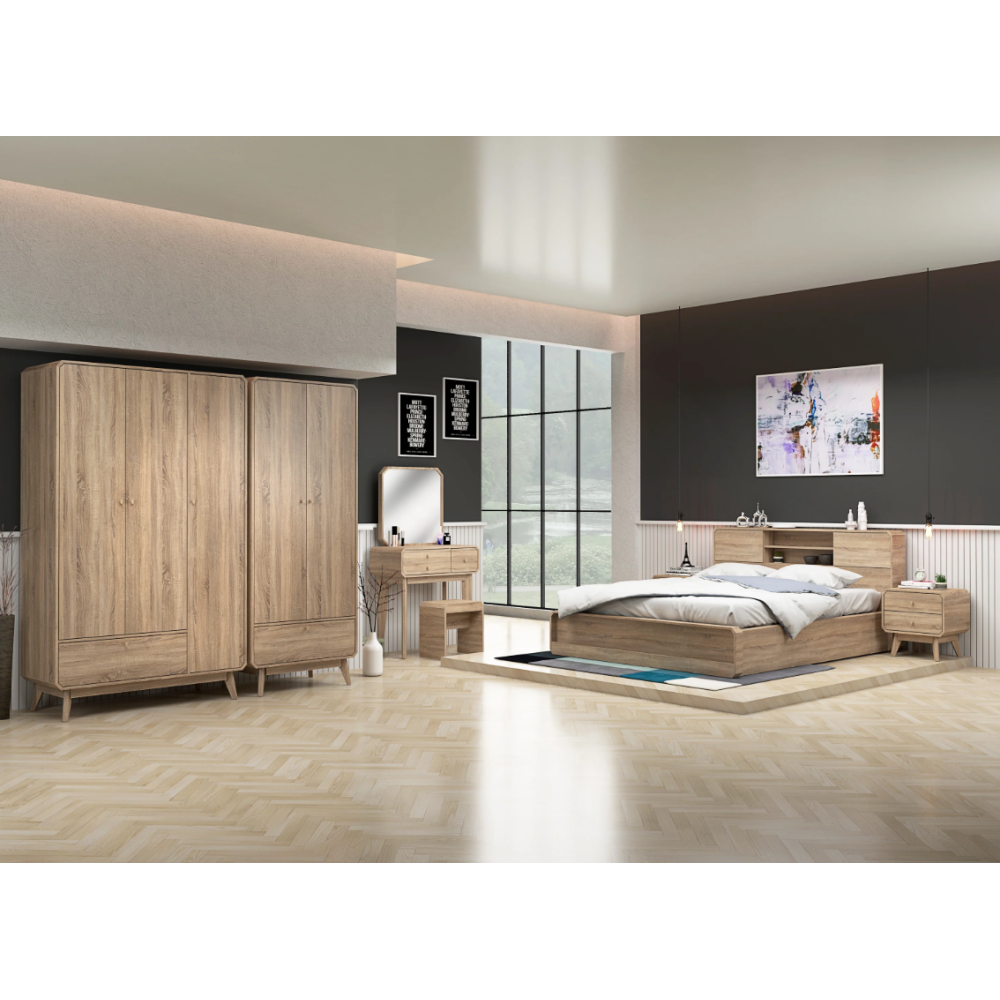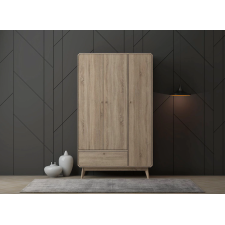 Armoire Hana WR1508MP-HO - À disposer idéalement dans une chambre à coucher - Fabriquée avec une structure en panneau de particules et MDF coloris chêne - Montée sur 4 pattes servant de support au meuble - Intègre 4 étagères internes et un tiroir bas pour le rangement du linge ou d’accessoires divers - Embarque un espace avec une tringle pour l’accrochage des vêtements sur cintre - Dispose de 3 portes fermant le meuble pour une sécurisation optimale des effets rangés dans le meuble – Conçue avec des petites poignées circulaires facilitant la manipulation des portes et du tiroir - Dimensions exactes de l’armoire : 110 cm de long, 500 cm de large et 1970 cm de haut.