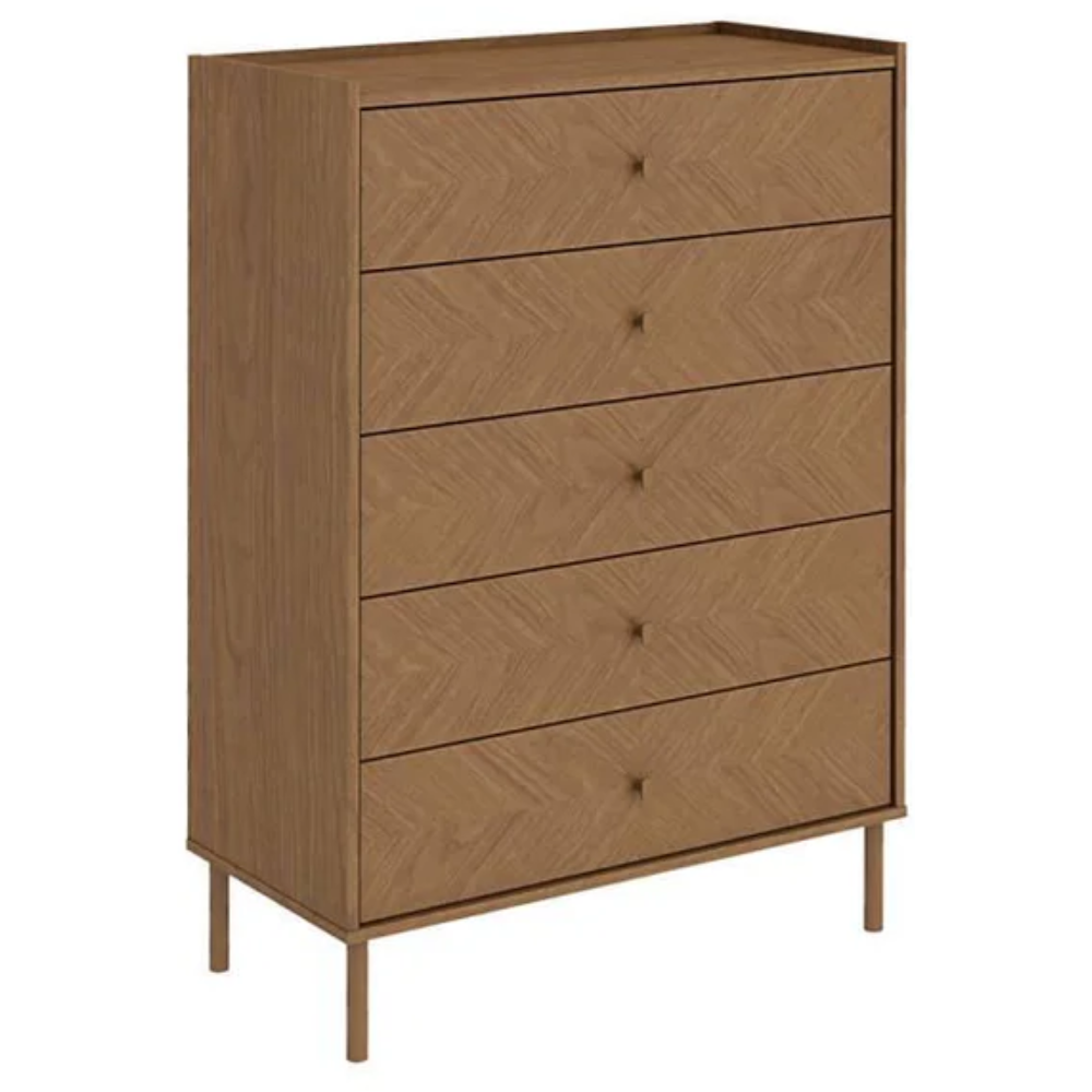 Commode LV44 COD4423MP-CLB au design recherché affichant une façade à motifs imbriqués de style lambrissé - Dispose de 4 pattes qui assurent sa stabilité - Conçue avec 5 tiroirs pour le rangement d’objets divers et 1 plateau supérieur exploitable pour la disposition d’une lampe de chevet, des livres ou des objets décoratifs - Inclut de petites poignées pour ouvrir et fermer les tiroirs - Embarquent des rails coulissants qui facilitent la glisse des tiroirs lors des manœuvres.