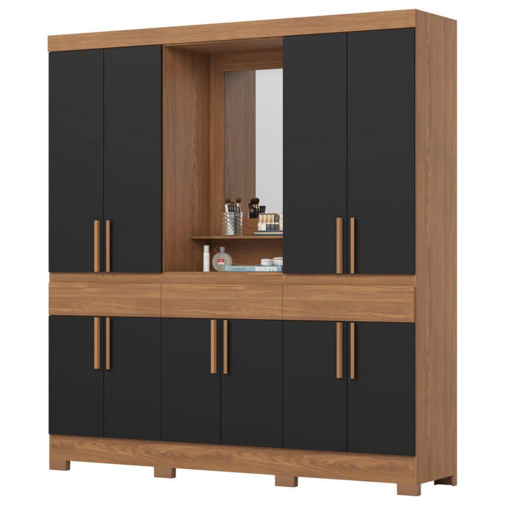 Armoire 10 portes à charnière et 3 tiroirs avec miroir intégré - Référence : B374-215 - Dimensions : 2000x2150x465cm - Offre une excellente capacité de rangement, vous permettant d'organiser vos vêtements, accessoires et autres effets personnels de manière fonctionnelle - Pieds en ABS avec une stabilité accrue - Finition moderne en coloris naturel et noir - Fabriquée en MDF de haute qualité avec une peinture texturée résistante aux UV.