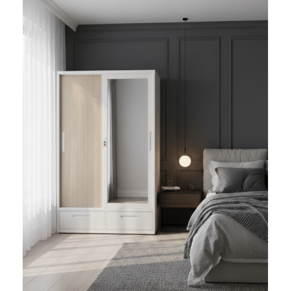 Armoire Fer Y005 avec ses portes coulissantes et ses 2 tiroirs apporte une touche de style à votre espace de rangement en vous permettant d'économiser de l'espace - Est spécialement conçue pour répondre à vos besoins de stockage tout en ajoutant une esthétique moderne à votre intérieur - Est équipée d'un miroir pour se préparer en toute simplicité, tout en ajoutant une touche de luminosité à votre espace - Conception soignée et aménagement intérieur optimisé - Dimensions : 1850 x 1200 x 500 cm.