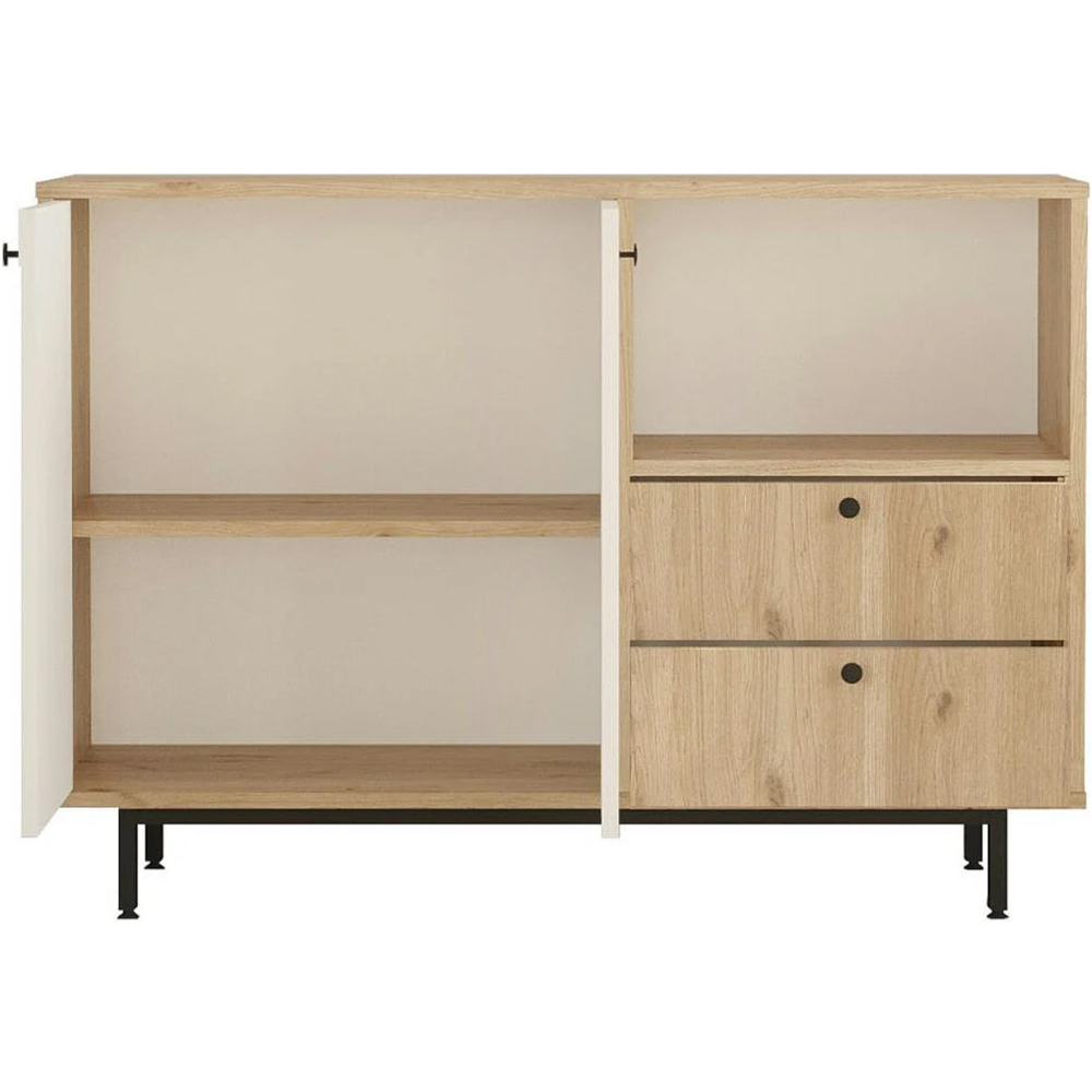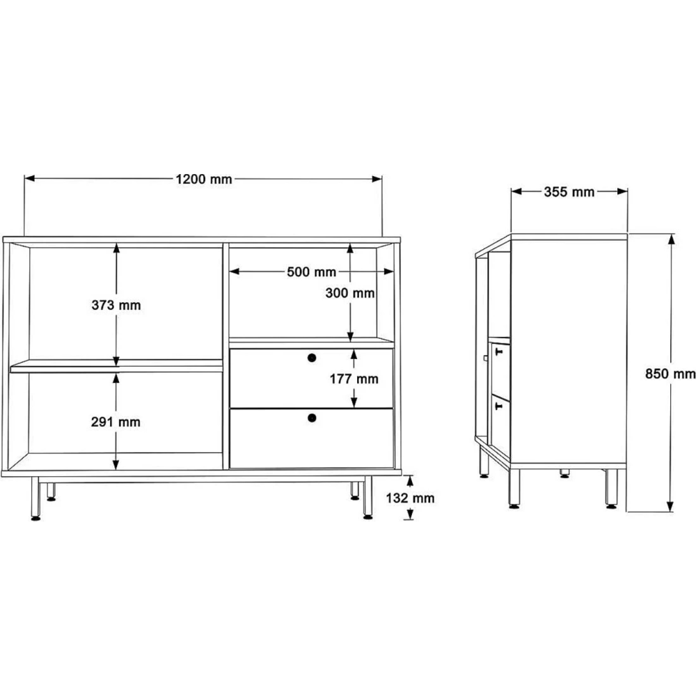 Buffet RE2-SW combine praticité, style et gain d'espace pour une cuisine bien organisée - Apporte une touche moderne et fonctionnelle à votre intérieur - Repose sur des pieds en métal noir qui lui confèrent un aspect industriel - Offre de nombreux espaces de rangement: 2 portes, 2 tiroirs et un compartiment ouvert au-dessus des tiroirs parfait pour installer votre micro-onde ou autre petit appareil - Bénéficie d'un plateau supérieur qui peut accueillir une décoration ou d'autres appareils légers - Coloris blanc chêne - Dimensions : 1200 x 35.5 x 850 cm.