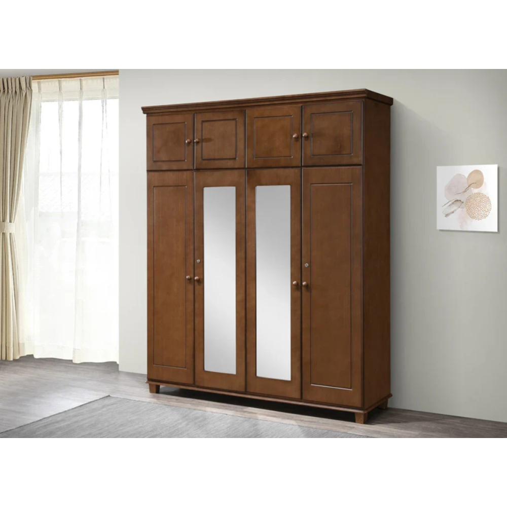 Armoire de rangement Marvin fabriquée en bois d’hévéa massif - Intègre un placage en bois et affiche des finitions nettes - Propose un volume de rangement optimal réparti sur 5 étagères internes - Dispose également d’un plateau supérieur exploitable pour poser de grands accessoires comme les valises - Embarque 2 miroirs au niveau des battants centraux et des poignées discrètes qui facilitent l’ouverture et la fermeture de l’armoire - Mensurations de l’armoire : 180 cm de large, 180 cm de haut et 54 cm de profondeur - Montée sur 4 pattes fabriquées en bois solide assurant la stabilité du meuble en tout temps.